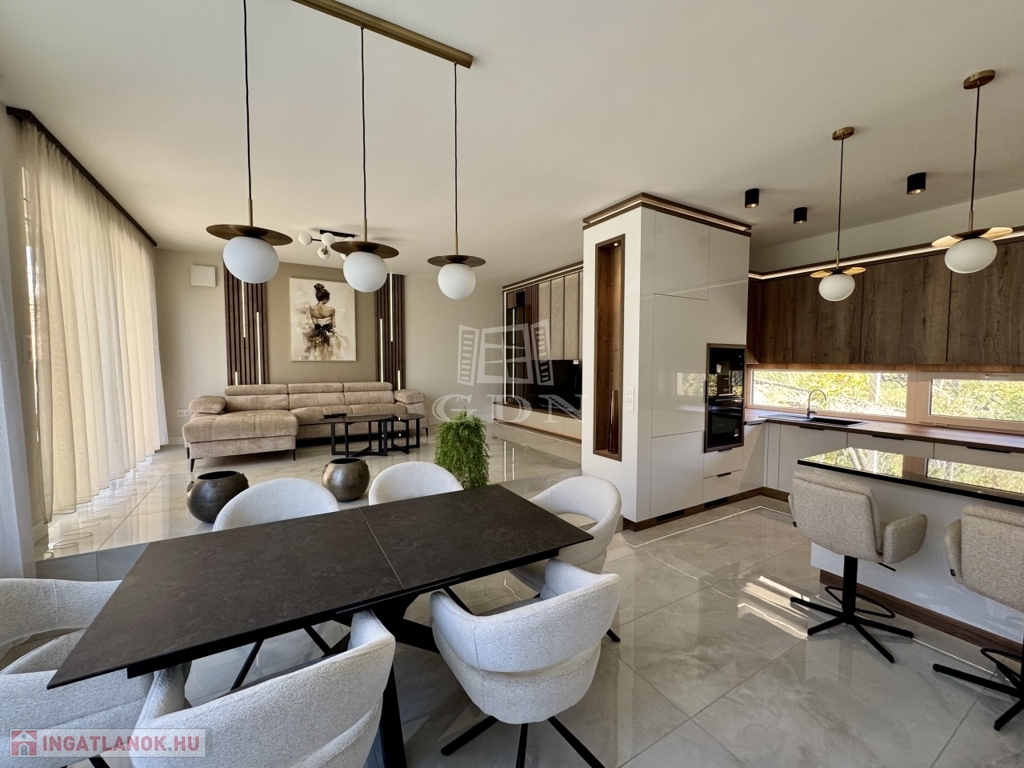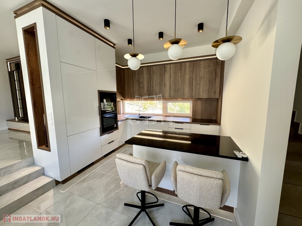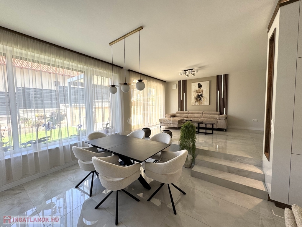 A ház tágas, világos terekkel, korszerű gépészettel, okosotthon-megoldásokkal és magas minőségű bútorokkal várja új lakóit. A parkoló 2 autó részére biztosít kényelmes beállást, a kertet kertépítő szakemberek parkosították, így nemcsak praktikus, de esztétikailag is lenyűgöző környezetet kínál.. Az otthon minden részlete gondosan megtervezett – a konyhától a fürdőszobákig –, így csak be kell költözni és élvezni a luxus nyújtotta kényelmet.