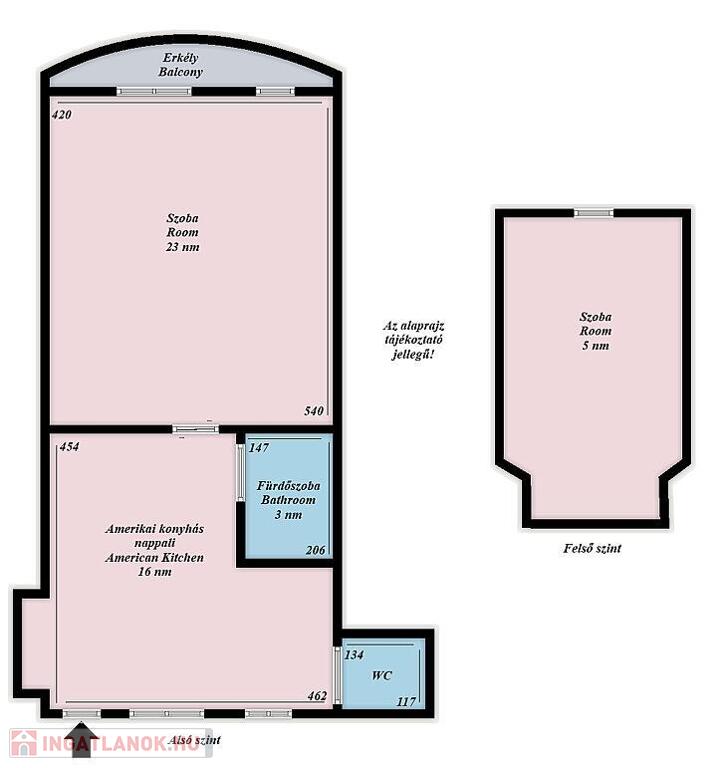- 2 szobás (alsó szint: nappali, konyha, fürdő, WC – felső szint: hálószoba)