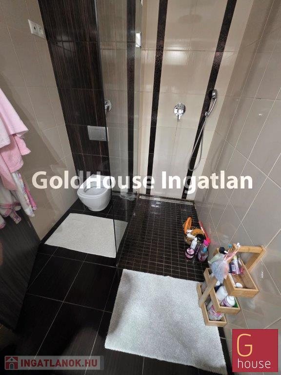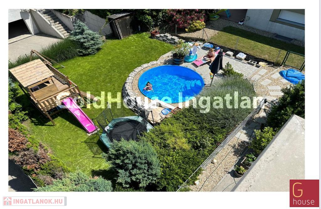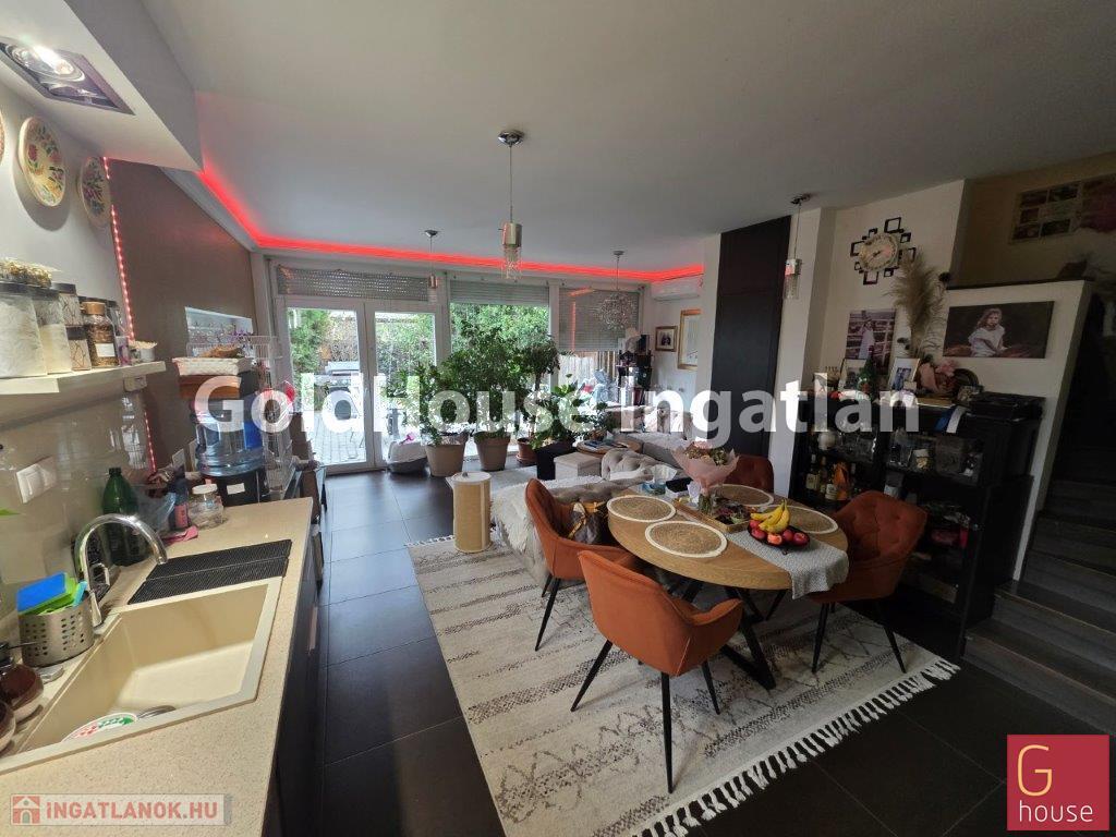 Az alsó szint tágas nappali–étkező–konyha tere egybefüggő, világos élettérként működik, közvetlen kapcsolatban a terasszal és a gondozott kerttel, ahol saját medence, kerti tároló és játszóvár biztosít kényelmet és kikapcsolódási lehetőséget.
