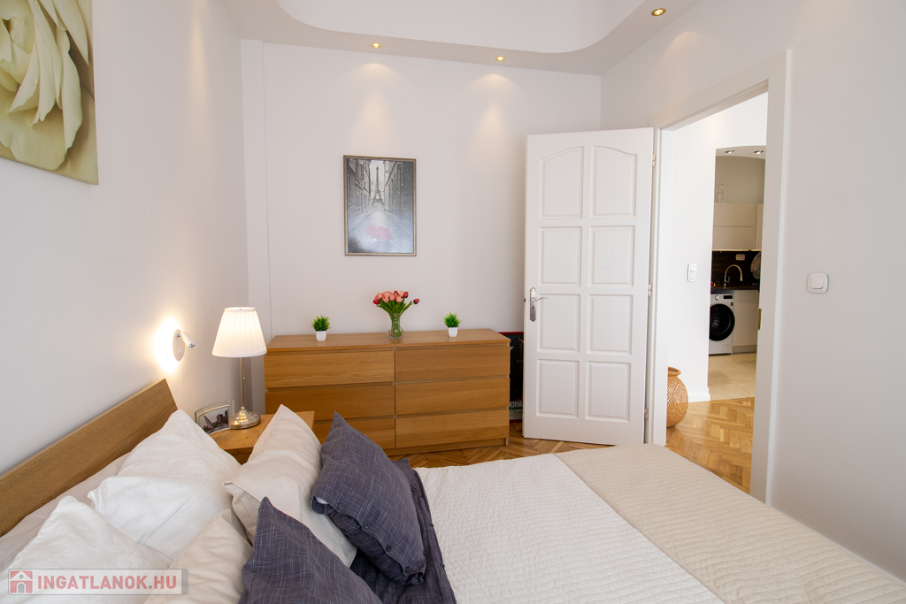 A nappaliból jutunk át a kellemes méretű, elegánsan bútorozott hálószobába.