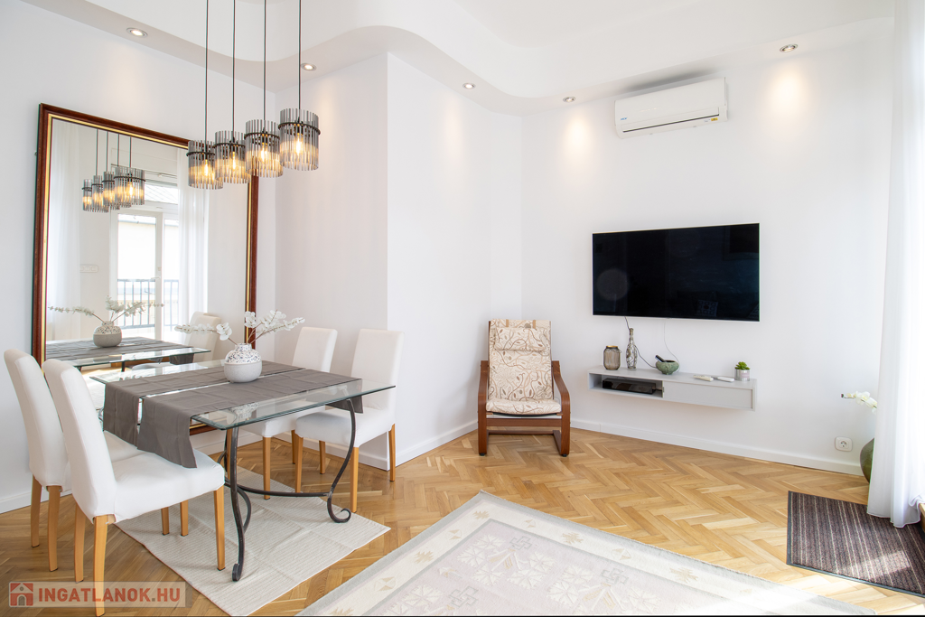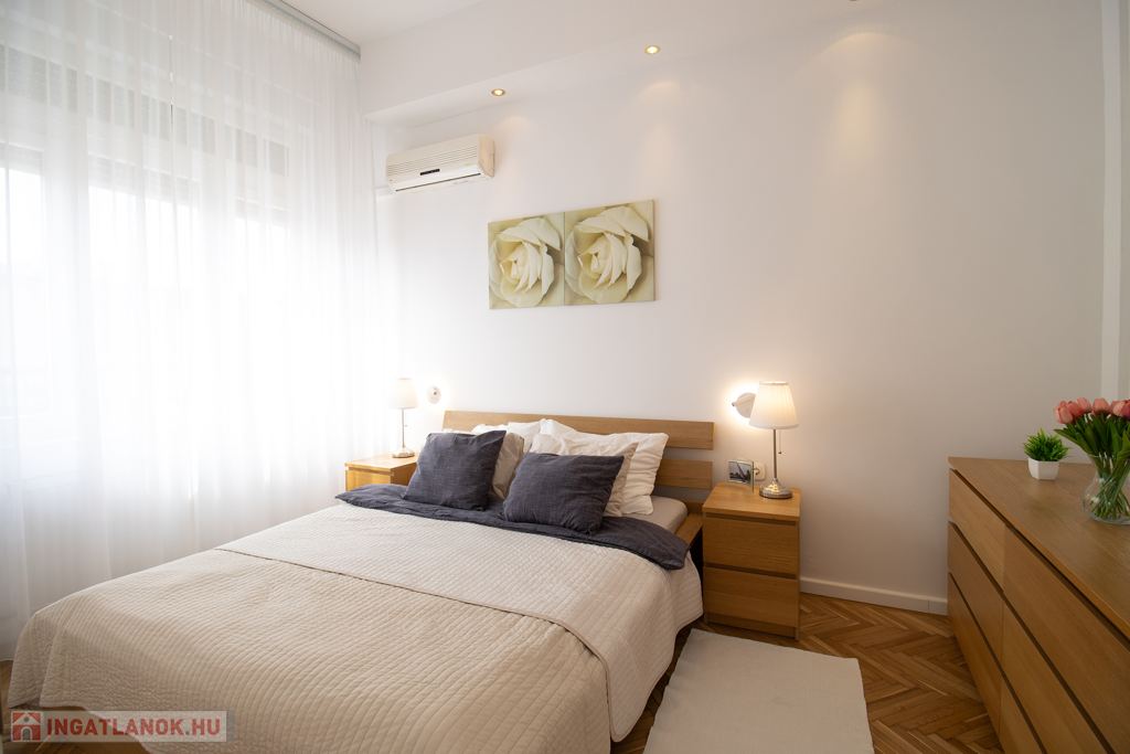 A lakás bútorozott, gépesített, légkondicionált, fűtése házközponti.