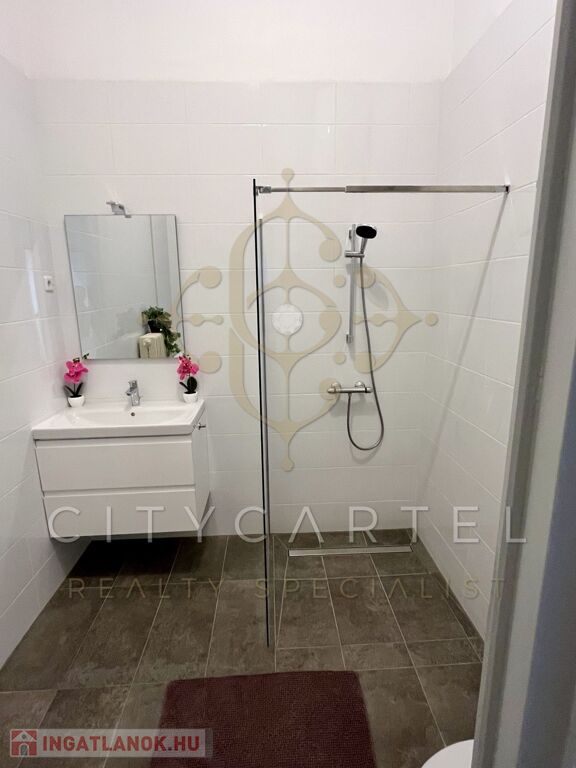 A fürdőszoba és a WC egy helyiségben található, korszerű kialakítással és igényes burkolatokkal.