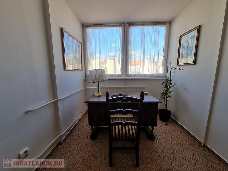 A város szívében, egy a 80-as évek végén épült, nyolcszintes társasház legfelső emeletén kiadó ez a különleges, két lakásból kialakított, impozáns tetőtéri otthon, amely méreteivel és elrendezésével igazi ritkaság a belvárosban.