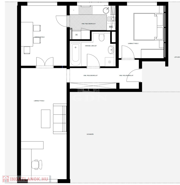 A belső terek kialakítása átgondolt: a nappali mellett két külön nyíló szoba biztosítja a funkcionális elrendezést - legyen szó hálószobáról, dolgozószobáról vagy gyerekszobáról.