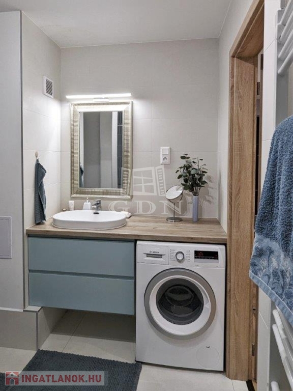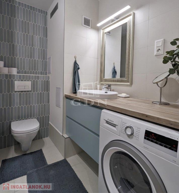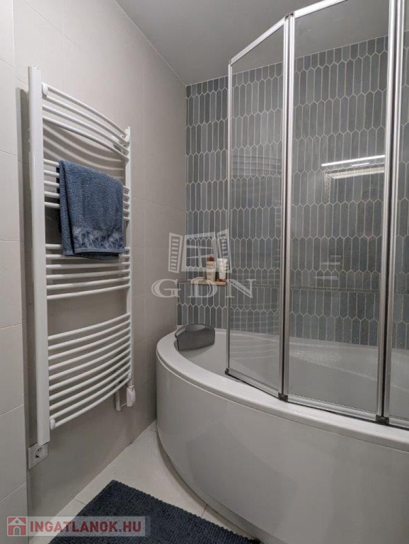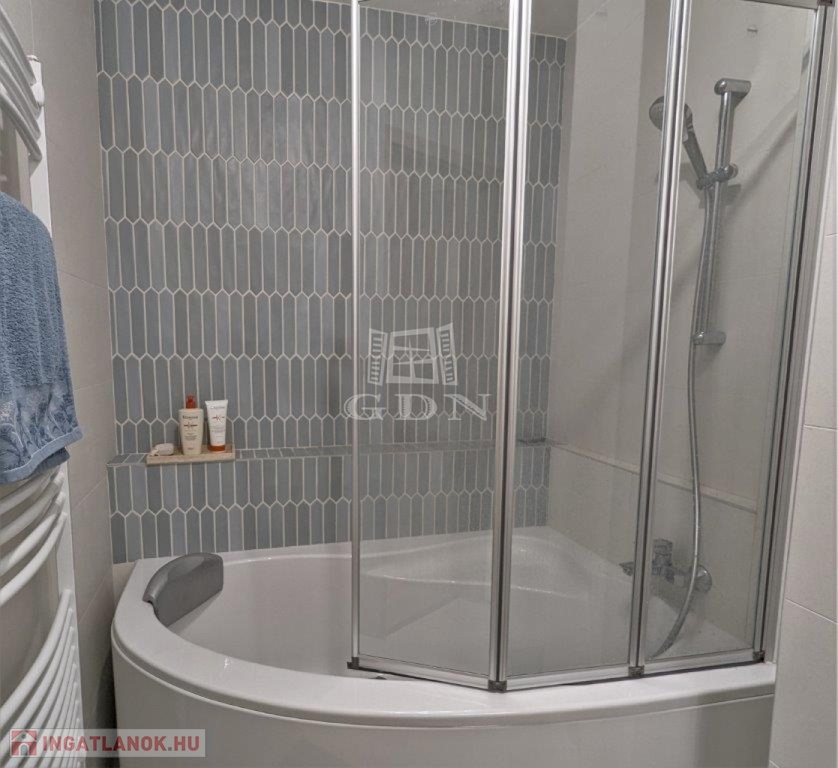 A fürdőszobában egyedi kialakítású kádfal és törölközőszárítós radiátor található, az előszobában pedig praktikus beépített szekrények segítik a rendszerezést.