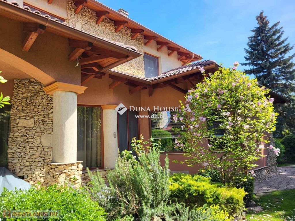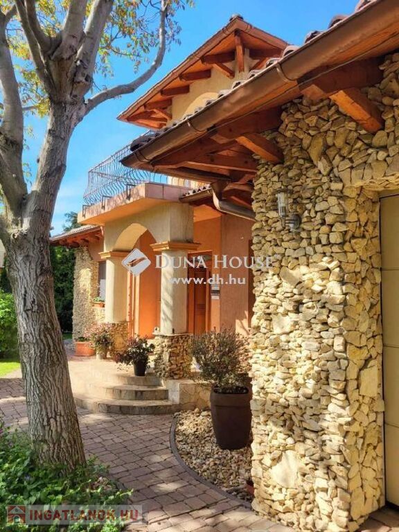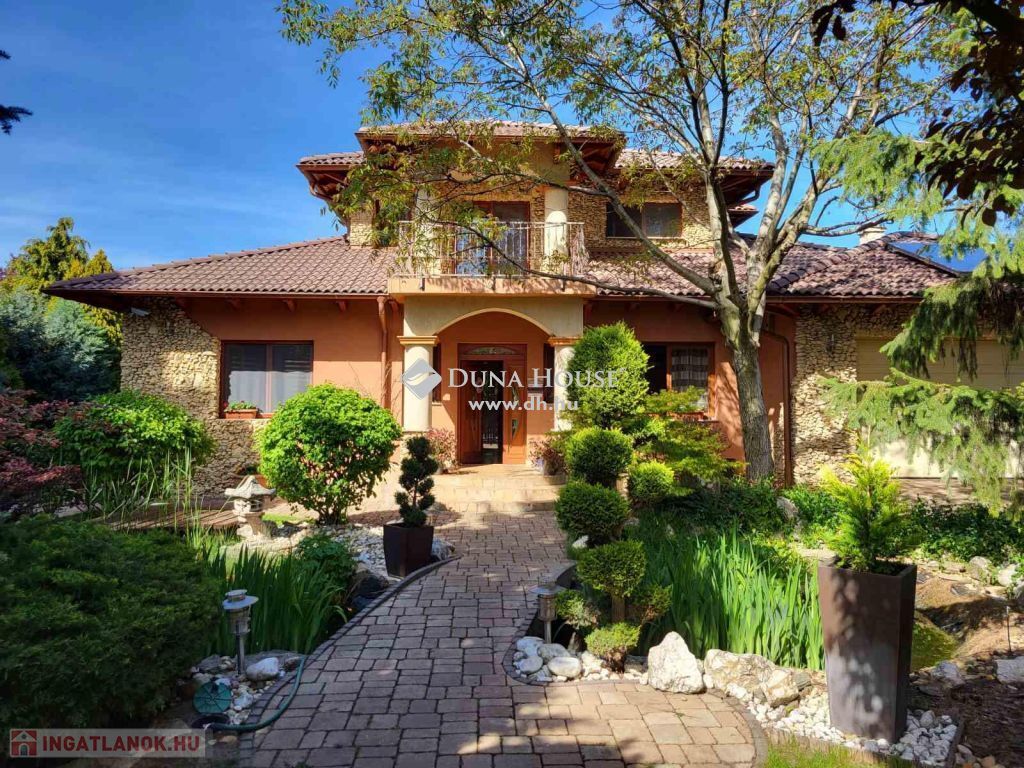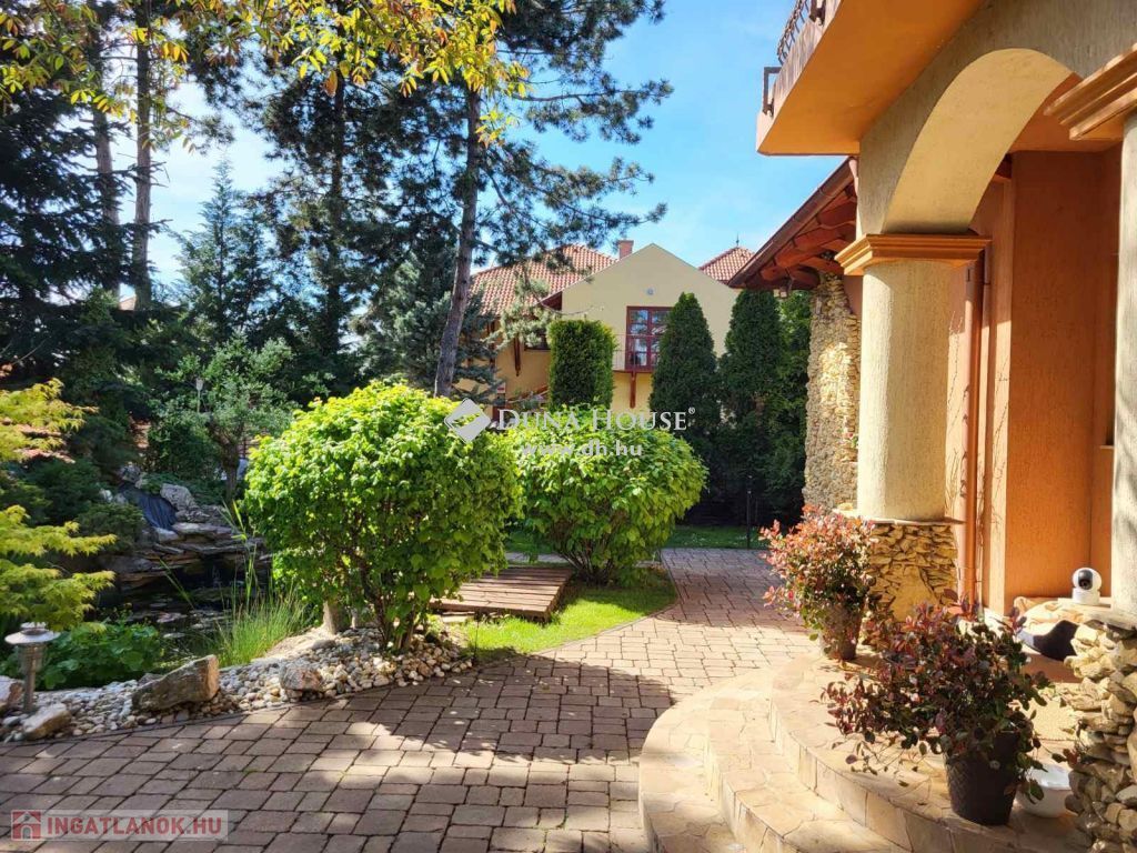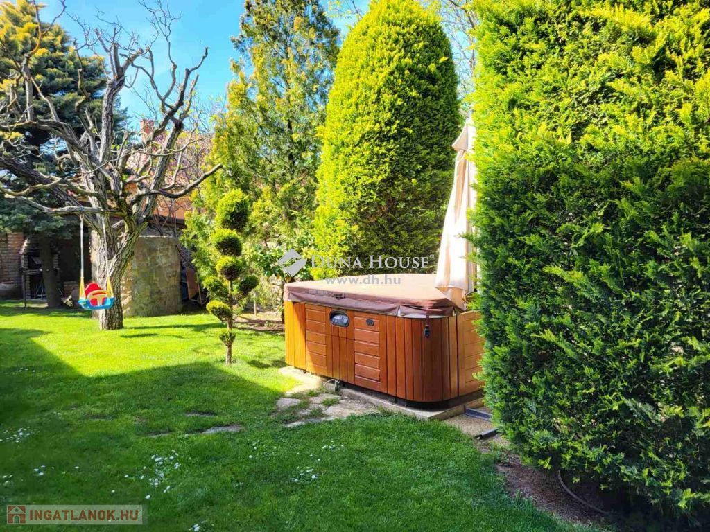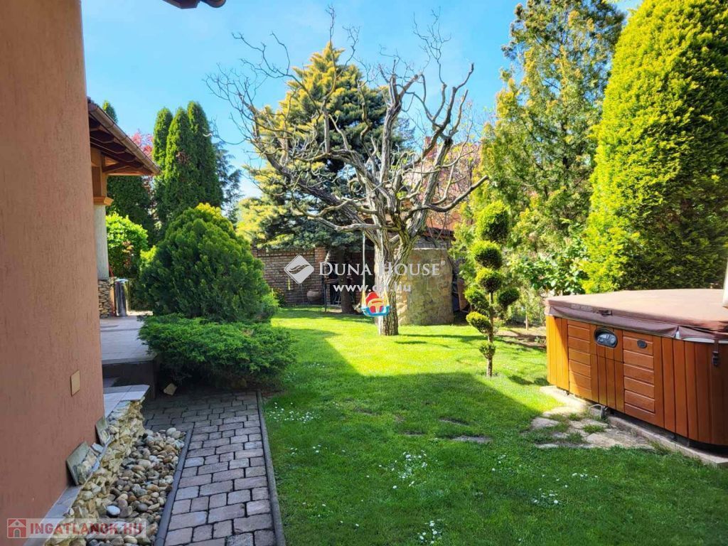 Kert jellemzői: Egyedi növények, örökzöldek , sziklakert, 2,5 méter mély kerti tó található. Bontott téglából 2,70 m magas kerítés a ház körül. Elektromos nagykapu az udvaron 5-6 autó kényelmesen parkolhat, garázsban 2 autó. Sütögető bontott téglából kialakítva, tágas 20 m2-es fedett terasz teszi kényelmessé a pihenést ami az intim kertre néz. Jakuzzi mellett helyet kapott egy tusoló is.