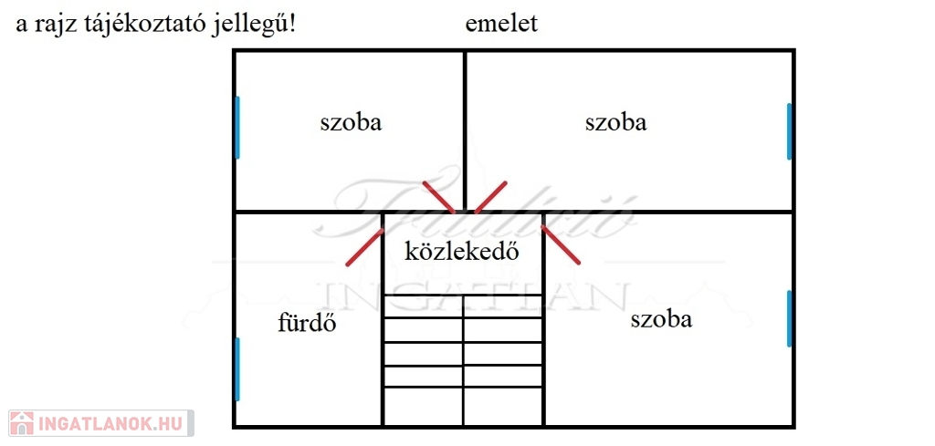Emeleti helyiségek: 3 külön nyíló szoba, fürdő, előszoba és lépcsőház.