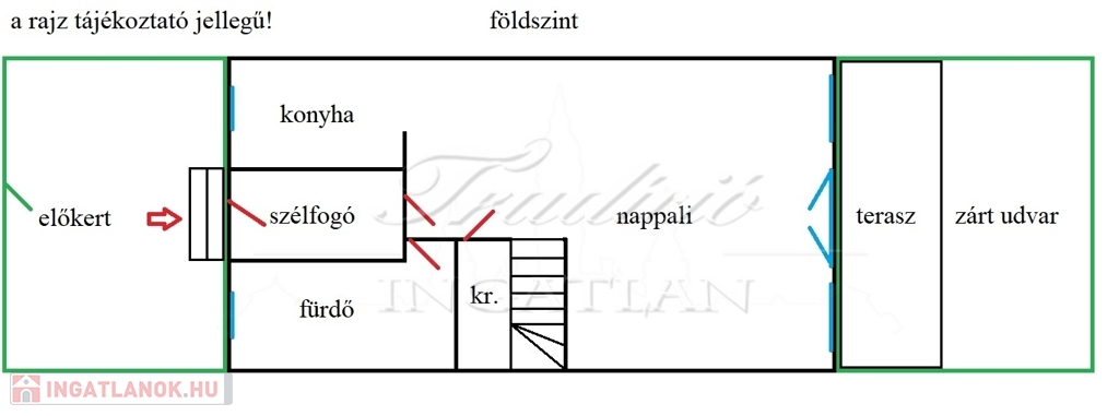 Földszinti helyiségek: szélfogó, nappali-konyha-étkező, előkert, zárt udvar, fürdőszoba, gardrób, lépcsőház.