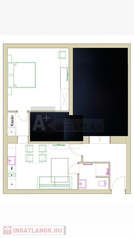 A lakás kialakítása : 1 nappali, 1 hálófülke ,konyha és fürdőszoba.